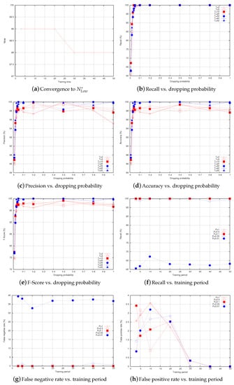 Figure 8a shows the values of that are observed by a given node in the network while monitoring one of its neighbors. At lower training periods, and it stabilizes at 98 starting from . Figure 8b–e show the recall, precision, accuracy, and F-score of the proposed IDS, respectively, as a function of dropping probability. The first observation we can draw from the figure is that the recall is 100% when the dropping probability is higher than 0.05, and it is under 100% when the dropping probability becomes 0.02 and 0.01. This can be explained, as follows: under very low dropping probabilities, the malicious nodes perform at low intensities and their activities become unnoticeable. This happens when it is difficult to distinguish between packet loss due to normal activities and packet drop attack, and we can notice this when the dropping probability becomes very close or less than the normal packet loss, which is, at most, during each time period. The same observation can be made from Figure 8c–e. However, they record lower results compared to recall results due to the effect of false positives. Figure 8f–h show the recall, false negative rate, and false positive rate of the IDS, respectively, as a function of the training period. The results are presented under the following levels of dropping probability . Under high dropping probabilities, the recall (resp., false negative rate) is (resp., ) for all of the training periods. Under low dropping probabilities, the detection rate decreases as the malicious behavior becomes very close to the normal one. We can notice that the false positive rate becomes 0 when the training period T reaches 30 in certain cases and 40 in others. At these values of the training period, is observed and the IDS can accurately distinguish between normal traffic and selective routing attack. For instance, when the dropping probability is 0.5, the false positive rate becomes 0 at . Before is observed (i.e., or ), the false positive rate curves are random, as they depend on the number of times the monitored profile is observed inside the interval , which itself depends on the probability of packet loss.