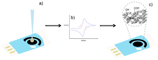 Electrochemical oxidation of the CNT surface on SPE. (a) Application of a H2SO4 drop on the CNT, (b) cyclic voltammetry for electrochemical oxidation, and (c) oxidized surface of the CNT on the SPE.