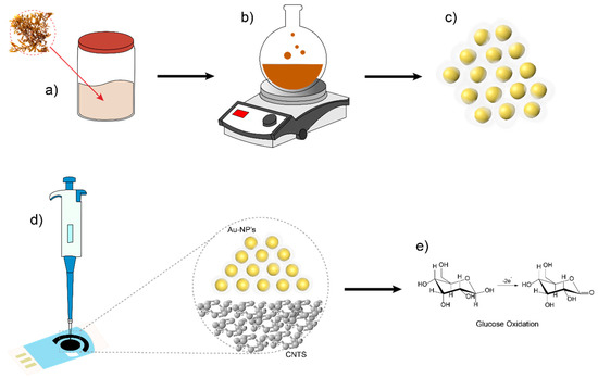 Electrode modification pathway by drop-casting technique using green synthesis AuNPs from Ssp for the assembly of a sensor with carbon nanotubes-screen printed electrodes (CNT-SPE) for glucose detection and quantification. (a) Extract of Sargassum sp. by infusion method. (b) Green synthesis of AuNPs using Ssp extract. (c) AuNPs with an organic capping from Ssp compounds. (d) Drop-casting of AuNPs on CNT-SPE electrode and their interaction. (e) Semi-reaction of glucose oxidation on the CNT-SPE modified with AuNPs.