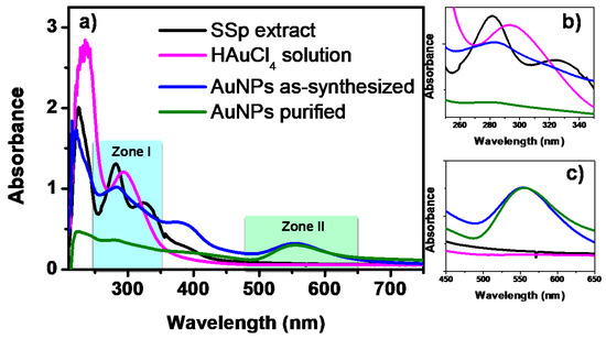 (a) UV-Vis analysis of the precursor salt, Ssp extract, and AuNPs before and after the purification process. (b,c) UV-Vis spectra of the zones I and II obtained from the (a).