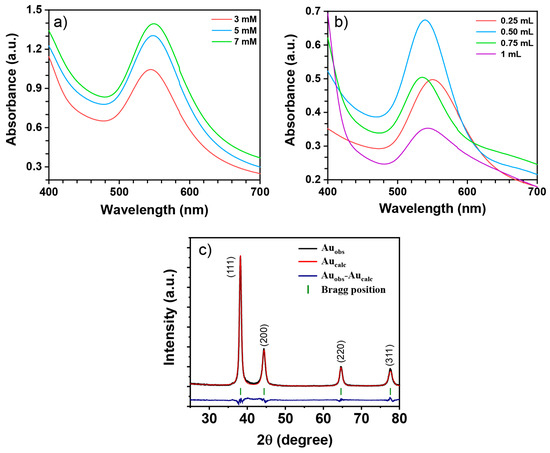 UV-Vis analysis of AuNPs varying (a) HAuCl4 solution concentration and (b) Sargassum sp. extract volume, (c) Rietveld refinement XRD pattern of Au nanoparticles.