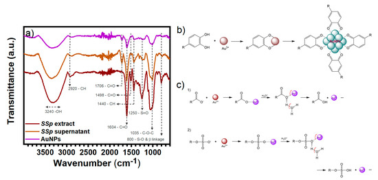 FT-IR analysis was carried out to determine the organic compounds involved in the AuNPs synthesis. The spectra of the Ssp extract (wine line), the supernatant obtained after washing (brown line) and the synthesized AuNPs (purple line) are shown in Figure 5a. The Ssp extract shows several characteristic bands. The signal located at 3240 cm−1 corresponds to the O-H symmetrical stretching vibration. Bands at 2920 cm−1 and 1440 cm−1 correspond to C-H symmetric stretching and C-H bending, respectively. The bands located at 1604 cm−1 correspond to C=O from polysaccharides and 1498 cm−1 correspond to C=O from aromatic bonds. The band around 1250 cm−1 corresponds to S=O asymmetrical stretching vibration from fucoidans. The band around 1035 cm−1 is related to C-O stretching from ester groups. Finally, bands at 894 cm−1 and 800 cm−1 show the presence of sulphate groups, since they can be attributed to S-O stretching. All these characteristic bands correspond closely to phenolic and polysaccharide compounds. The supernatant studied showed similar bands with a decrease in some intensities and the bands corresponding to O-H, C-H, C=O, C-O, and S-O bonds still present. On the other hand, the spectrum of AuNPs showed fewer bands and different intensities. Only signals located at 3220 cm−1, 2920 cm−1, 1706 cm−1, 1604 cm−1, 1440 cm−1, 1182 cm−1, 894 cm−1 are still present, corresponding to O-H stretching, C-H stretching, C=O stretching, C=O from polysaccharides, C-H stretching, C-O stretching, and S-O stretching, respectively.