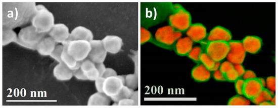Figure 6a shows the secondary electron-scanning electron microscopy (SE-SEM) micrograph of the synthesized AuNPs. As can be seen in this micrograph, there is a high concentration of nanoparticles, of various morphologies, and an organic compound that is coating the nanoparticles is clearly visible. These results confirm the ability of the Ssp extract to synthesize AuNPs. Figure 5b shows a color look-up table (LUT) image formed by mixing the SE-SEM and backscattered electron-scanning electron microscopy (BSE-SEM) micrographs. It is clear from the image that all the nanoparticles are coated by an organic compound (green) from the Ssp extract, and the characteristic shapes of the nanoparticles (red) are shown in greater detail. The catalytic activity and selectivity of the nanoparticles depend on the shape, morphology, and size. The particle size ranges from 80 to 100 nm, with several polyhedral shapes. The presence of various polyhedral shapes can be attributed to the different organic compounds involved in the reaction described. For face-centered cubic metals, single-crystal seeds tend to evolve into single-crystal products with polyhedral shapes, the so-called Wulff polyhedrons, depending on the ratio of growth rates along the (111) and (100) facets, which is determined by the type and concentration of the capping agent [52]. Most nanoparticles are shaped like the Wulff polyhedron (truncated octahedron); however, some nanoparticles were obtained with different shapes that can be attributed to the equilibrium condition never being reached during synthesis. The surface energies are different due to anisotropic interactions of the capping agent [53].