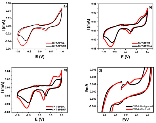 Figure 8d shows a close-up of the oxidation and reduction peaks present on the CNT-SPE/A. In the black line, two oxidation signals (−95 mV and 68 mV) and two more of reduction (8 mV and −206 mV) related to the background (buffer) can be observed. When an appropriate volume of glucose is added to obtain a concentration of 8 mM (red line), the oxidation and reduction peaks of buffer (except the signal in 68 mV) disappear and a new peak is observed at 346 mV, associated to the response of glucose oxidation on CNT-SPE/A.