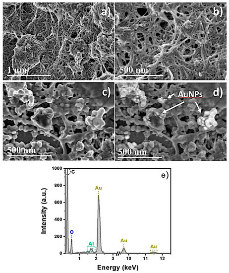 Figure 9a,b shows the SE-SEM micrographs of the commercial CNT-SPE. The micrographs show a dense mesh-like deposit of CNT of irregular sizes. The CNT-SPE looked like porous carbon electrodes because of the disordered arrangements of the CNT over the SPE surface. The SE-SEM micrograph of the commercial CNT-SPE modified with AuNPs of Figure 9c shows that some CNTs are visible on the surface, indicating that the electrode still has a certain porosity. Likewise, Figure 9d shows the mixed SE and BSE-SEM micrograph of the commercial CNT-SPE modified with AuNPs. The bright dots are the AuNPs, distributed uniformly over the surface of the electrode. Figure 9e shows the energy dispersive spectroscopy (EDS) spectrum of the commercial CNT-SPE modified with AuNPs. The EDS spectrum (Figure 7e) shows the presence of Au, O, and C (the Al signal is associated with the sample holder), which comes from the sample.