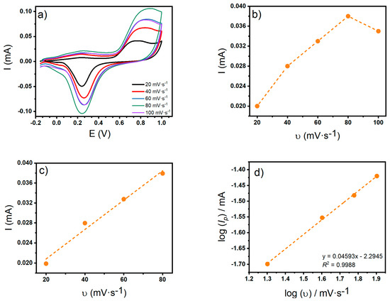An interesting aspect in the electrochemical analysis is the variation in potential and current peak intensities generated in CV with the change of sweep rate (20–100 mV s−1). These are parameters that can help to characterize physicochemical aspects of the reaction. Figure 11a shows the CV voltammograms overlapped at different sweep rates with the presence of 10 mM glucose on CNT-SPE/A/AuNPs. Figure 11b presents the dependence of the anodic peak current at different sweep rates, up to 100 mV s−1, showing a linear behavior up to 80 mV s−1 (Figure 11c). There is also a linear relationship between and , seen in Figure 11d, given a slope value of 0.4593 and a relation coefficient of R2 = 0.9988.