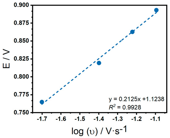 As mentioned earlier, scan rate variations give an insight into the electrochemical process. From the linear fitting from and , it is observed that its slope value is close to 0.5, confirming that the electrode process is diffusion controlled [56]. The fit of Ep and , suggests that this is an irreversible process, according to the expression from Laviron theory in Equation (1) [57]: