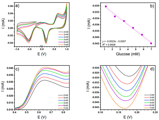 (a) Cyclic voltammetry to glucose at different concentrations, (b) Calibration curve using the cathodic peak currents, (c) Close-up of the oxidation signal, (d) Close-up of the reduction signal.