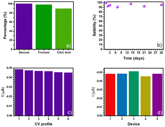 (a) Effects of the presence of food additives fructose and citric acid on the CV measurement for 7 mM of glucose in CNT-SPE/A/AuNPs, (b) electrochemical response stability of the CNT-SPE electrode after 30 days to 7 mM of glucose, (c) evaluation of repeatability, and (d) evaluation of reproducibility.