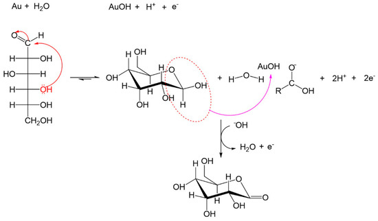 In a second step, the interaction of hemiacetal group of glucose and the adsorbed hydroxyl make oxidation possible, with the H bound to C1 being the first to suffer the oxidation on AuNPs, producing the radical species, which is reflected in the voltammogram to glucose on CNT-SPE/A/AuNPs in 645 mV. The radical species are also oxidized to produce gluconolactone, where another electron is transferred to the electrode. Then gluconolactone is desorbed to the electrode-forming sodium gluconate in the same way it is reduced backwards. This whole process involves the transfer of two electrons, as can be observed in Scheme 2.