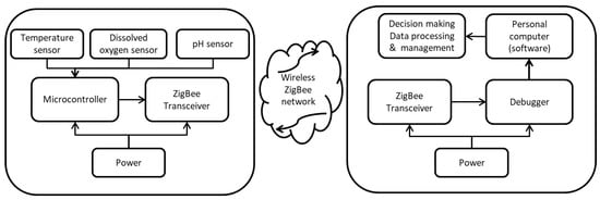 Briefly, the system consists of an open-source platform for hardware development with a network of wireless sensors of temperature, dissolved oxygen, and pH sensors. The system was adapted using software on a desktop computer using a serial port based on a depurator (USB serial converter). Figure 1 shows the model used for the monitoring of water-quality variables. The information generated by the sensors was read every minute and stored every 5 min; complete measurement of all three variables took about 3 s.