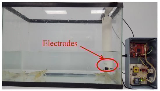 Experimental setup with 7 g five shrimp in 20 L of marine water and the proposed electronic system (gray box).