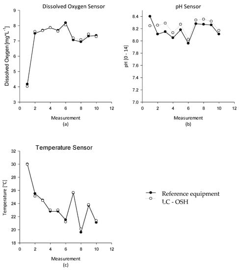Comparison between reference equipment and low-cost proposed system: (a) dissolved oxygen sensor, (b) pH sensor, and (c) temperature sensor.