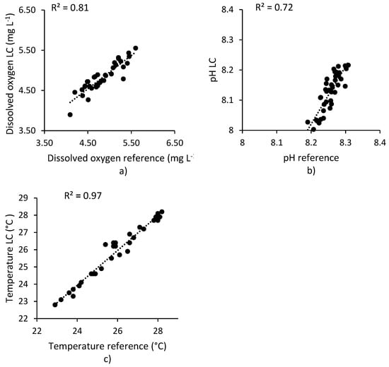 Scatterplots of low-cost open source hardware data versus reference equipment data. Dotted lines show the calculated r2 value of dissolved oxygen (a), pH (b) and temperature (c).
