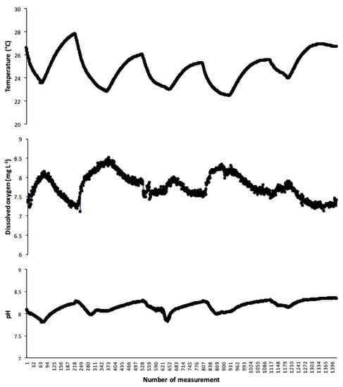 Regarding the repeatability test, the statistical analysis showed no significant differences among repetitions in any of the three parameters measured by the proposed LC OSH system. The mean temperatures were 23.66, 23.72, and 23.86 °C for repetitions 1, 2, and 3, respectively. For dissolved oxygen, the means were 6.44, 6.95, and 6.85 mg L−1 for the three repetitions; while, for pH, the mean values were 8.05, 8.37, and 7.94.