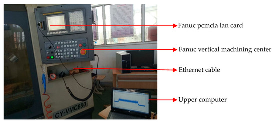 Firstly, the Fanuc Servo Guide software was installed on the upper computer (the computer used to receive the spindle current signal). Then, the upper computer communicates with the CNC machine tool through the ethernet-based transmission control protocol and internet protocol. As shown in Figure 2, the Fanuc Pcmcia Lan Card is an external network card; one end of it is connected to the Fanuc vertical machining center, and the other end is connected to the upper computer through an Ethernet cable.
