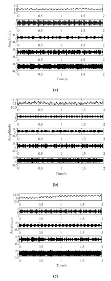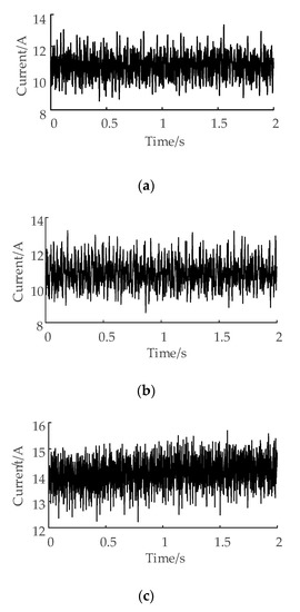 (a) Time–domain waveform of the current signal at the initial tool wear stage, (b) time–domain waveform of the current signal at the normal tool wear stage, and (c) time–domain waveform of the current signal at the sharp tool wear stage.