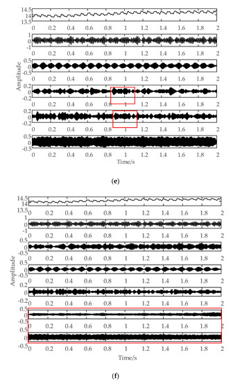 When using VMD to decompose signals, the number of modal components should be set in advance. If the set number is too small, the signal cannot be effectively decomposed, which will affect the extraction of effective features. If the number is too big, it will cause mode mixing and also affect the extraction of effective features; therefore, it is necessary to ensure that the signal is decomposed sufficiently and that mode mixing cannot occur. Table 1 and Figure 5 both show that the signal cannot be decomposed sufficiently when k is 2, 3, or 4; when k is 6, the phenomenon of mode mixing begins to appear in the red box in Figure 5e; when k is 7, the phenomenon of mode mixing becomes more obvious, as shown in the red box in Figure 5f. As such, we set K to 5 in our experiment. Figure 6 shows the results of the VMD chart of the current signal in different tool wear conditions.