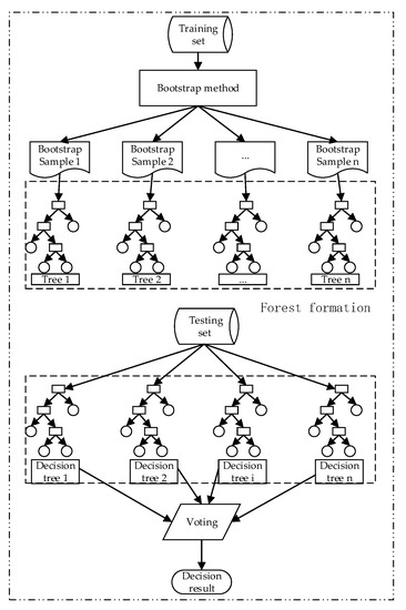 The random forest (RF) algorithm is an EL method that builds a forest of decision trees from bootstrap samples of a training dataset. Every decision tree produces a response, given a group of predictor values. In every decision tree, each internal node represents a test on an attribute, each branch represents the outcome of the test, and each leaf node represents a class label for classification. Based on each decision tree and voting rules, the final classification result of RF is obtained.