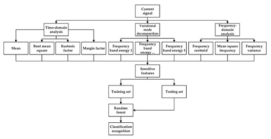 For example, VMD has been used to extract features from the nonstationary Bluetooth transient signals to improve classification accuracy. According to the classification results, a higher classification performance is achieved when higher-order statistical features are extracted from band-limited modes in the implementation of VMD in the radio frequency fingerprinting of Bluetooth devices [18]. Ruicheng et al. [19] used the VMD algorithm to extract the low-frequency displacement of the global navigation satellite system. According to the simulation and measured data, the VMD algorithm can effectively resist the modal aliasing caused by noise and discontinuous signals compared to the commonly used empirical mode decomposition (EMD) algorithm. Sahani et al. [20] applied the VMD to the real-time identification of power quality events in electrical power systems. Through the decomposition of the harmonic signal and flicker signal in power systems, the features for power quality identification were obtained. The experimental results showed that this method has a strong, robust antinoise performance and lesser computational complexity. Xiao et al. [21] used the VMD algorithm to decompose the original surface electromyogram signal into multiple variational mode functions (VMFs) and calculate the corresponding composite permutation entropy index (CPEI) of each signal component, and these CPEI features are applied to recognize hand actions. The experimental results show that the method based on VMD and CPEI for hand motion classification is feasible and accurate. Liu et al. [22] adopted the VMD algorithm to extract the time–frequency domain characteristic features of the arc current signals. Compared with some traditional modal decomposition algorithms, the decomposition results show that VMD can obtain high-quality frequency bands by avoiding the modal aliasing; therefore, in this study, we implement the VMD to decompose a nonstationary current signal.