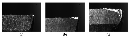 During the test, new cutting tools were used to carry out the cutting test under experimental conditions. After each cutting test, the value of the tool wear was measured off-line using a microscope. Figure 10 shows the tool images of different wear stages.