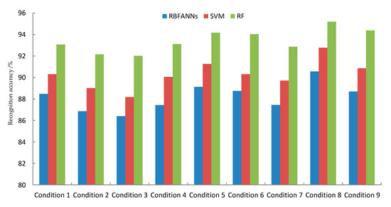 The predicted recognition accuracy under different conditions with different classifiers. RBFANNs: radial basis function artificial neural networks, SVM: support vector machines, and RF: random forest.