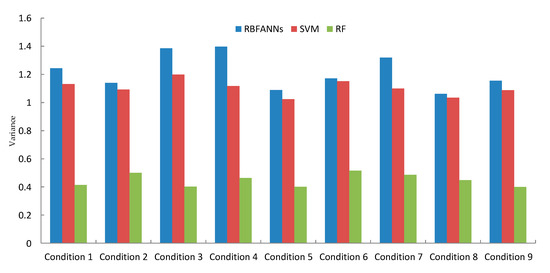 Figure 11 and Figure 12 show the predicted recognition accuracy and variance under different conditions with different classifiers using RBFANNs, SVM, and RF, respectively.