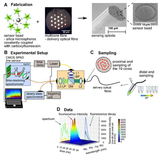 The sensing optode fabrication, experimental setup, and sampling for the time-resolved and steady-state pH measurements: (A) the aminomethyl silica microspheres (10 μm, PSI-10.0NH2, Kisker Biotech GmbH & Co., Steinfurt, Germany) were covalently coupled to carboxyfluorescein before being deposited into the etched cores of a 19-core multicore fibre (MCF). Scanning electron microscope (SEM) images of the sensing optode and a bead (functionalised microsphere) are shown. (B) Experimental setup used for the investigation of the response of the fluorescence emission to bead loading density and pH changes. The setup comprised a pulsed laser source, a coupling and collection system, and either a steady state spectrometer or a time-resolved spectrometer (Key: L—lens, BP—bandpass filter, DM—dichroic mirror, G—transmission grating, LP—longpass filter). (C) The distal end sampling of the fluorescence emission was achieved by inserting the sensing optode into buffer solutions at various pHs and automatically scanning across each of the 19 cores at the proximal end. (D) Two-dimensional data of spectrally and time-resolved fluorescence emission from the excited fluorophores.