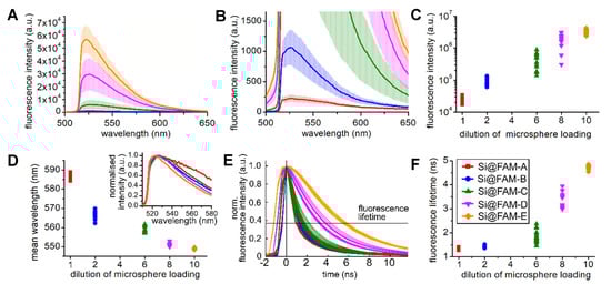 The observed features of decreasing fluorescence intensity, spectral broadening, and decreasing fluorescence lifetime with increasing bead loading indicate a quenching effect between the fluorescent molecules. On the highly loaded beads (e.g., Si@FAM-A), the fluorescent molecules are in such close proximity that intermolecular self-quenching occurs. According to the manufacturer, the microspheres have 1 × 109 free NH units on their surface to which fluorophore molecules can attach.
