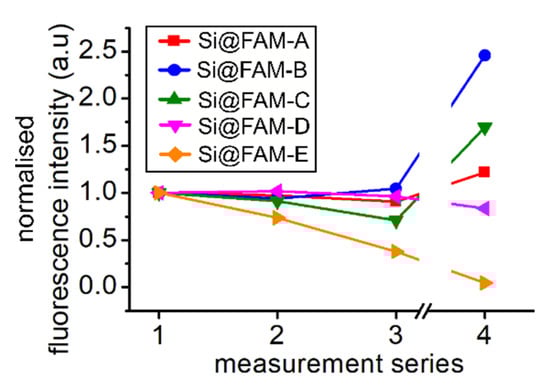 In Figure 3 we observe that the majority of beads showed a reasonably stable fluorescence during the three repeats of steady state measurements, with only more notable changes observed in the fourth measurement. However, the greatest variation is visible in the less densely loaded beads, Si@FAM-E, which shows significant photobleaching over the measurements. This is in direct agreement with results presented in Choudhary et al. [] (Supplementary Information), in which signal degradation is examined during repeated illumination.