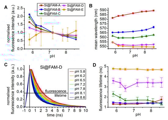 Changes in the spectral line shape due to pH responses were quantified with the mean wavelength (see Figure 4B). The higher loaded beads showed a red-shift compared to those with a lower loading, increasing at higher pH (most apparent for Si@FAM-A and Si@FAM-B). The beads with the highest loading exhibited a fluorescent lifetime below that of our measurement system (time resolution ~400 ps and Instrument Response Function (IRF) ~1 ns [,]. Lower loaded beads exhibited the expected longer lifetimes, however, Figure 4C,D highlight that the fluorescence lifetime of an intermediate fluorophore bead loading changes in an interesting way in response to pH. A decrease in lifetime is observed at higher pH, where normally an increased intensity signal would also be expected, but here a decrease is seen. The explicit observation of decreasing lifetime at higher pH is consistent with increased quenching occurring, reducing both emission intensity and lifetime when an isolated fluorophore would have been more active. This is also consistent with the observed increased red-shift (spectral broadening) seen at higher pH.