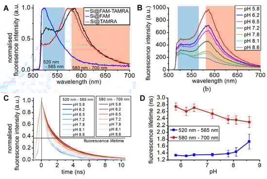 Figure 5B shows the spectral changes of the combined fluorescence system in response to pH. The intensities of the characteristic tetramethylrhodamine emissions changed strongly, and the carboxyfluorescein region relatively little. Figure 5C shows the pH dependency of the normalised fluorescence decays, and Figure 5D shows the fitted fluorescence lifetimes, from the carboxyfluorescein (blue) and tetramethylrhodamine (red) dominated regions of the spectra. The carboxyfluorescein dominated decays show a short fluorescence lifetime similar to that seen in the highly loaded carboxyfluorescein beads, e.g., Figure 2E Si@FAM-A. The tetramethylrhodamine dominated region shows a longer lifetime for tetramethylrhodamine (expected fluorescence lifetime of ~2.3 ns), which decreases with increasing pH. Again, we noticed the further difference in the rising dynamics of the fluorescence decay for the carboxyfluorescein and tetramethylrhodamine dominated regions, not represented in the fitted lifetime.