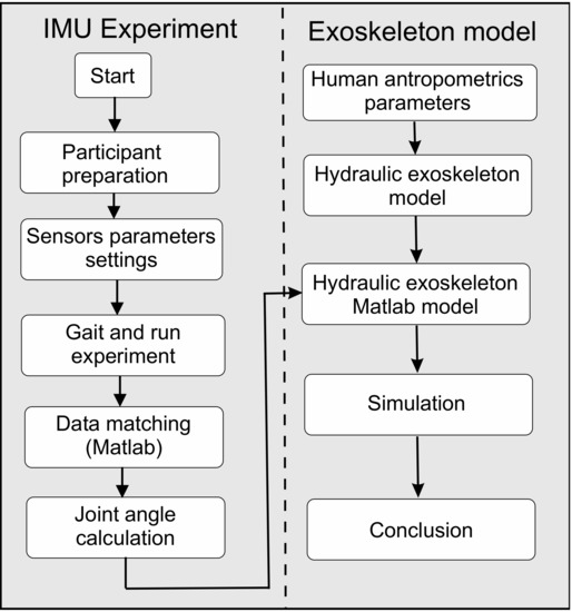 Our research was divided into two parts: IMU experiment and exoskeleton model with the simulation (Figure 1). Twenty-six subjects (male = 14, female = 12) participated in this study. The study protocol was approved by the Bioethics Committee at the district medical chamber in Gdansk (KB-14/20). Before the study, the principal investigator explained all procedures in detail to the subjects. The acceptance rate was 100%. This means that all subjects agreed to wear the sensors and participate in the experiment. The participants’ mean age (SD) was 22.8 years (0.79), mean height was 169.45 cm (8.26), and mean body weight was 68.05 kg (9.27), respectively. All the tested persons walked and ran on a flat surface at the speed they preferred. The research equipment included a ProMove mini platform with mini sensors [17]. This device consists of a wireless network to transfer data to a computer. This makes it possible to analyze data in real time. By using ProMove mini sensors, it is possible to record data in continuous time. Each sensor has a built-in memory with storage up to 7 h [18]. The device contains triaxial accelerometers, gyroscopes, and magnetometers. All channels are sampled at 1000 Hz. The range of accelerometers is ±16 g and the range of the gyroscopes is to 2000 deg/s. The flash memory of each sensor is 2 GB, and the low-power RF (radio-frequency) transceiver is in the 2.4 GHz license-free band. Because of the ergonomic design, the ProMove sensors can be easily attached to the body with a strap. Each sensor is 51 to 46–15 mm in size. This weighs 20 g including the battery. Data collection <100 ns is synchronized by an Inertia gateway as the central hub connected to a personal computer via a USB (Universal Serial Bus). All data (experimental samples, orientation as Euler angles or quaternions, acceleration along three axes and angular velocities) are downloaded by the Inertia Studio package. Next, they are recorded for further analysis. During the experiment, sensors were placed along the right and left legs, more specifically on the thigh, lower leg, and foot. In a global coordinate system, the X-axis is the moving direction and the Y-axis is the lateral direction. The Z-axis presents the opposite direction of gravity. The orientation of each sensor is calculated relative to the Earth’s reference frame. As a result, roll, pitch and yaw sensor angles are acquired. Based on the orientation of each sensor, the angles in the individual joints of the lower limb in the sagittal plane were acquired. A joint coordinate system (JCS) was proposed by the Standardization and Terminology Committee (STC) of the International Society of Biomechanics [19]. In experiments, hip, knee, and ankle motions were calculated by the orientation of each segment. Next, these were described in the XYZ-Euler angle representation. IMUs were placed on the parallel plane to the anteroposterior plane. The proposed exoskeleton model works in the sagittal plane, and, therefore, we based our calculations only on the angles in the sagittal plane. To compute the hip, knee, and ankle angles, the sensor frames were transformed into a joint/mutual coordinate system (JCS). The multiplication of the single rotation matrices around each axis transforms the sensor frame at any time step into the initial sensor frame. The rotation matrices are determined by the equation below.