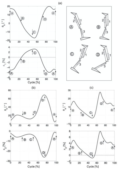 The angles in the joints and length of the hydraulic exoskeleton actuators, while running: Hip joint (a), knee joint (b), and ankle joint (c). A, B, C and D-exoskeleton positions presented on the top right side.