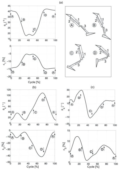 Data are presented graphically so that time is normalized to 100% of the cycle (Figure 4). Figure 5 and Figure 6 show the change in the angles of individual joints and the length of the hydraulic exoskeleton actuators in free walking and while running. The actuator piston length was determined as half the distance between the cylinder attachment points in the initial position. Individual actuators are marked in the drawing with numbers from 1 to 3. The hydraulic exoskeleton of each lower limb has three degrees of freedom in the sagittal plane.