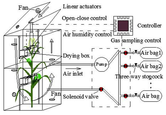 A humidity control system was developed to reduce the influence of the chamber on the microclimate and crop physiology. Due to the application of a humidity control system, the maximum difference between outdoor and indoor humidity and temperature was 5.6% and 0.457 °C, respectively. The range for the changes in leaf temperature and the maximum relative changes of maize leaf respiration rate were 0.3 to 0.3 °C and 23.2015%, respectively, during the NEE measurement period. The effects of the chamber on the environment and physiology of crops were weak.
