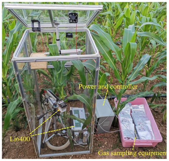 This chamber can be used as a dynamic closed chamber or a static closed chamber. Compared with static closed chamber method, the dynamic closed chamber method requires a shorter time to complete a NEE measurement and the environment in the dynamic chamber changes less. Dynamic closed chambers are generally considered to be more accurate than those used in static methods [20]. Furthermore, because the duration of each experiment is only 15 min, there was little variation in maize field NEE in one plot and we assume that the NEE value of maize in this period is a constant value. Therefore, in this study, we used the dynamic chamber method to evaluate the measurement accuracy of the static chamber method. For the static chamber method, the gas sampling device (Figure 3) collects the gas in the chamber using the pump at 0, 5, 10, and 15 min after the chamber was closed. Then, the CO2 concentration of the samples was analyzed using gas chromatography (GC-2010PLUS, Shimadzu, Japan) within 24 h. For the dynamic chamber method, the variation in the CO2 concentration was monitored using the Li6400 for approximately 5 min and the data were logged every 10 s. In each measurement, the two methods were carried out at the same time using the same chamber. The experiments were performed about every six days, at around 10:00 PM each time. The NEE was determined using the following equation [15]:
