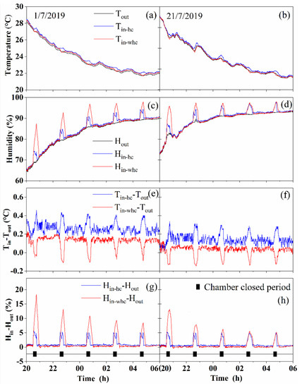 During the measurement day, humidity variation inside the chamber using the humidity controller (Hin-hc), humidity variation inside the chamber without the humidity controller (Hin-whc), and air humidity variation outside (Hout) the chamber showed an upward trend from 8 PM to 6 AM (Figure 4c,d). When the chamber was in the open state, similar to the temperature results, Hin-hc − Hout and Hin-whc − Hout (Figure 4g,h) also fluctuated around a constant value. When the chamber was in the closed state, Hin-hc − Hout increased slightly, with a maximum of 5.6% from several experiments. Hin-whc − Hout revealed a rapid rising trend in several experiments, and the maximum value was 18.3%. When the chamber changed from the closed state to the open state, Hin-hc − Hout and Hin-whc − Hout rapidly decreased to the pre-closure levels.