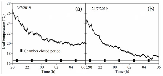 The leaf temperature variation results are shown in Figure 5. The temperature of the leaf inside the chamber showed a downward trend from 8 PM to 6 AM. When the chamber was in the closed state, the maize leaf temperature changed slightly and the percentage distribution of the temperature variation ranges (ΔT) during the closed chamber period can be seen in the Table 1. The ΔT was mainly distributed between −0.3 and 0.3 °C when the chamber was in the closed state. The values of ΔTmax and ΔTmin were 0.37 and −0.38 °C, respectively.
