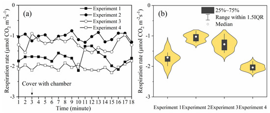 In experiments 1 and 2, a single 110 cm height chamber was used to cover the maize in the vegetative stages. In experiments 3 and 4, two 110 cm high chambers were used to cover the taller maize plants in the reproductive stages, as shown in Figure 1. (a) Graph showing the changes in the respiration of leaves before and after the maize was covered. (b) Graph showing the violin plot with a box plot for each experiment (IQR = interquartile range).