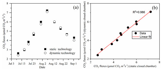 Figure 7a shows the CO2 exchange measurements obtained using static and dynamic closed chamber technology at 10 PM on different days. The CO2 exchange values obtained using static and dynamic closed technology were in very good agreement throughout the duration of the measurements. The difference in NEE measured using dynamic and static methods was between −0.29 and 0.16, and the relative errors were distributed between 8.71% and −3.35%. The minimum value was observed on the July 3, which may be because the biomass of the maize was relatively small and the CO2 flux increased continuously from July 3 to August 7. The CO2 flux then began to decrease as the date increased.
