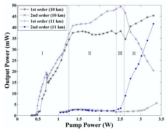- Zhang, H.; Zhou, P. Hundred-watt-level high power random distributed feedback Raman fiber laser at 1150 nm and its application in mid-infrared laser generation. Opt. Express 2015, 23, 17138–17144. [Google Scholar]