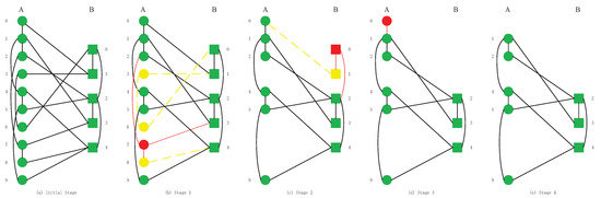 In Figure 2, we give the processes of cascading failures in a simple CPS model. In the interdependent networks model, the ratio of inter-links is 3:1. We intercept the connection of some nodes in the model. We assume that the model links relationships shown in the figure. Ten nodes in network A and five nodes in network B in the initial stage. Initially, there are ten nodes and five nodes in network A and B. The random attack upon network A causes failure of node . In the initial stage (Figure 2b), we remove all intra-links and inter-links that are linked to node (node is shown in the red circle, and links are shown in solid red lines). Thus, and (shown in yellow circles) are departed from the giant component of network A. In stage 2, and are removed with all links (shown in yellow dotted lines in (b)). Consequently, two network nodes B fail, while node (red square) is excluded from the giant component, and (yellow square) loses inter-links. In this way, in stage 3, node , and their links are deleted, network B fragments into components. Node (red circle) fails because it does not have a supporting link from network B. In the final stage (Figure 2e), the normal working nodes of this system reach a stable stage and cascading failures will not occur. As the cascading failure stops, there are five nodes in network A and three nodes in network B can operate normally.