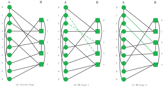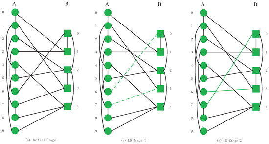 In Figure 3a initial stage, we calculate the degree value of a node by determining the number of intra-links within it. Based on the initial system shown in (a), the nodes with the lowest degree value in network A are , , , , . These nodes all have the same value of degrees, and the value is 1. In network B, the lowest degree value nodes are , , and the degree value is 1. According to the LD strategy requirements, we must ensure that the number of inter-links in nodes does not change. In the model, connects with an inter-link and links by one inter-link. All inter-links of , and are connected to the nodes with the lowest degree, so no swapping operations are required. node depends on node while depends on nodes and . The degree value of node is smaller than the node . For this reason, we swap inter-links among , , , and as indicated in (b) by green dotted lines. The inter-links’ relationship after a successful LD swapping strategy in the system is shown in Figure 3c by green solid lines. After the above operations, we complete the swapping inter-link operation once.