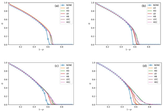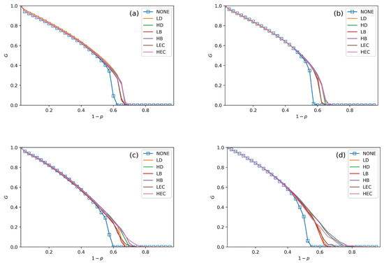 - From all subfigures, we plot in Figure 5, Figure 6 and Figure 7. We conclude that the HB swapping strategy can be the first choice in improving G and HEC is the first choice in improving values. HB strategy shows the best performance in improving the value of G, and the HEC strategy is better in enhancing values. The values of in Figure 5a–d figures under the HEC strategy are 0.66, 0.69, 0.73 and 0.84, in Figure 6a–d are 0.68, 0.69, 0.75 and 0.85, and in Figure 7a–d are 0.68, 0.7, 0.78 and 0.82. This conclusion is more significant in the SF–SF CPS model. In Figure 5d, the value of under HEC is close to 0.8. The value of with HEC is more than 0.8 in Figure 6d. This finding is different from [39,44]. We reveal that network construction plays a vital role in system reliability.