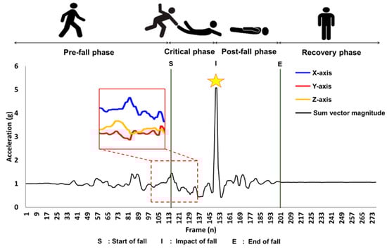Description of four phases of falls. A subject loses balance during the critical phase of fall and the body heads down to ground which shows a direct impact during a fall. The peak of sum vector magnitude at the impact during critical phase of fall is indicated by a star.