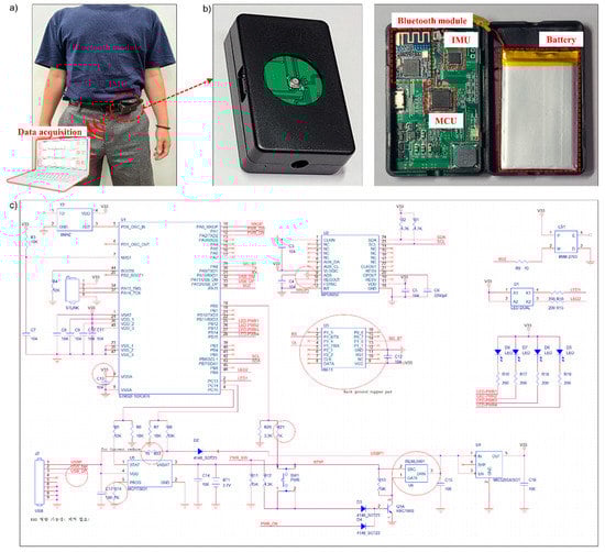 (a) A custom designed inertial measurement unit (IMU) sensor placed on the left anterior iliac crest of the pelvis of a subject; (b) Raw data are sent and received from the Bluetooth module and the receiver of a workstation; (c) Diagram showing the custom designed IMU circuit diagram.