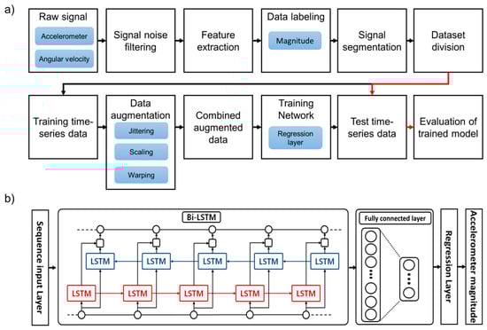 The overall architecture of our proposed model for predicting impact acceleration magnitude during a fall is shown in Figure 3a. The main architecture is composed of a sequence input layer, two bi-directional LSTM layers, a dropout layer, a fully connected layer, a softmax layer, and a regression layer. Two bi-directional LSTM layers were added between the sequence input layer and the fully connected layer. The one dropout layer was added between two bi-directional LSTM layers. It was added to decrease overfitting of the bi-directional LSTM layer. Predicting fall impact acceleration magnitude is performed for the regression layer. Detailed architecture of the bi-LSTM network is shown in Figure 3b.