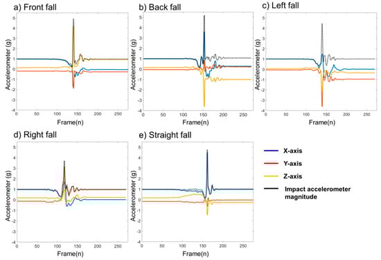 Tri-axial accelerometer collected from an inertial measurement unit (IMU) for five types of falls. (a) the IMU signal for forward fall; (b) the IMU signal for backward fall; (c) the IMU signal for leftward fall; (d) the IMU signal for rightward fall; (e) the IMU signal for straight fall.