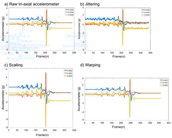 Generation of new training datasets based on raw signals with application of each augmentation approach is shown in Figure 5. Three data augmentation techniques ((i): jittering; (ii): scaling; and (iii): warping) were applied to raw data at four different levels. Increasing the jittering value will create a new signal to become noisier than the raw signal as shown in Figure 5b. Additionally, as the scaling value increases, the magnitude of IMU signal gets bigger, meaning that the impact acceleration magnitude value is increased as shown in Figure 5c.